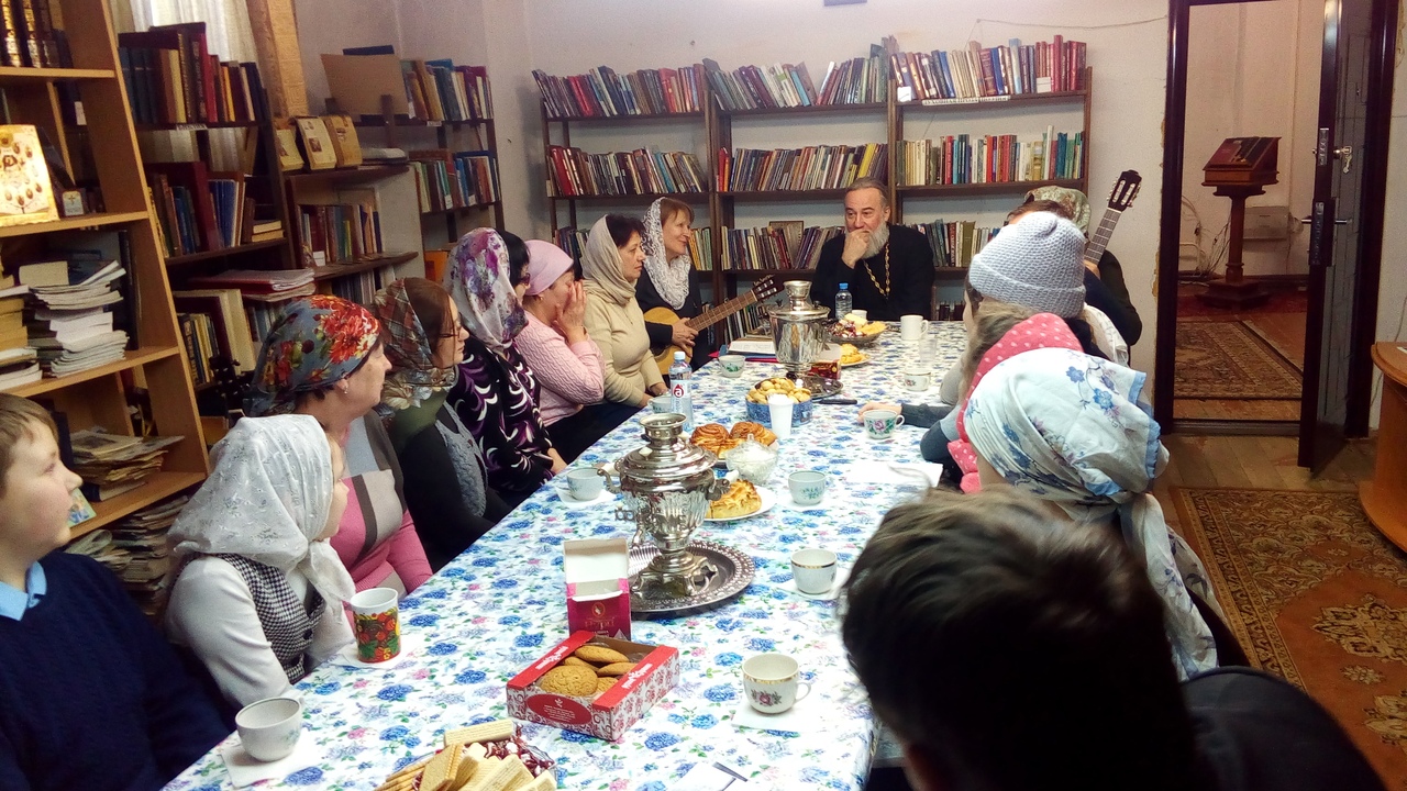 За совместным чаепитием гости и хозяева исполнили песни под гитару. Причём никто не остался в стороне: все пели, играли на гитаре или на шумовых инструментах – и взрослые, и дети! Собравшиеся исполнили песни «Как ныне сбирается вещий Олег», «За отрока, за голубя, за сына» (на стихи М.Цветаевой), «Русь называют святой», «Надежды маленький оркестрик», «Авторская песня», «Дама за рулём», «В этом храме старинном» и другие.